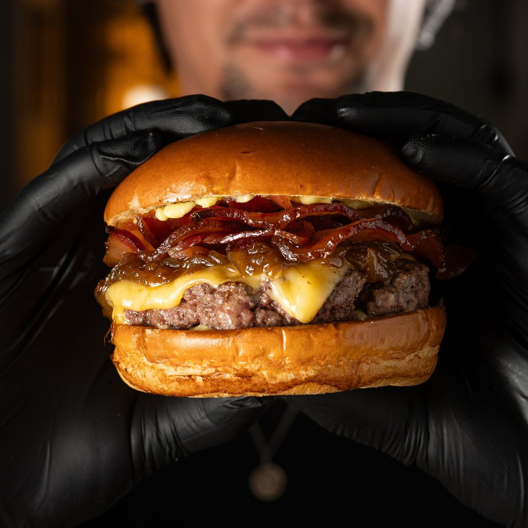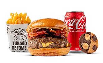 Uma refeição completa, onde o hambúrguer é um blend bovino 180g, bacon crocante, cebola caramelizada, queijo derretido, pão brioche tostadinho e maionese caseira. Acompanham uma coca geladíssima, uma batata frita pequena super crocante e um cookie de sobremesa.