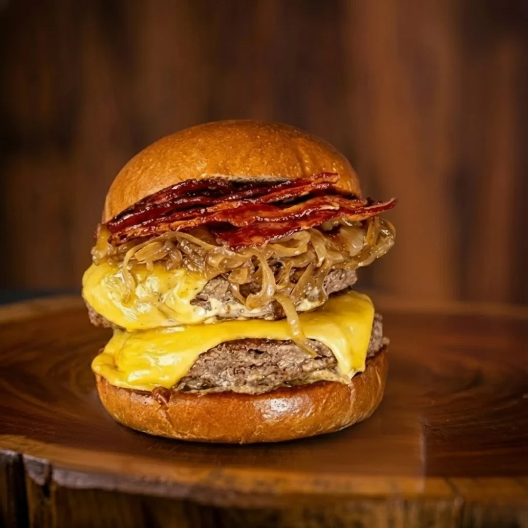 Pra quem chega com fome de leão! O Duplo Bacon é tipo o super-herói da comida. Pão brioche na manteiga, dois hambúrgueres top de 180g cada, carne fresquinha e tudo selecionado. O bacon crocante é daqueles de outro planeta e a cebola caramelizada é um trato lento cheio de sabor.