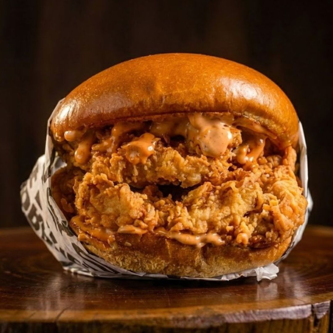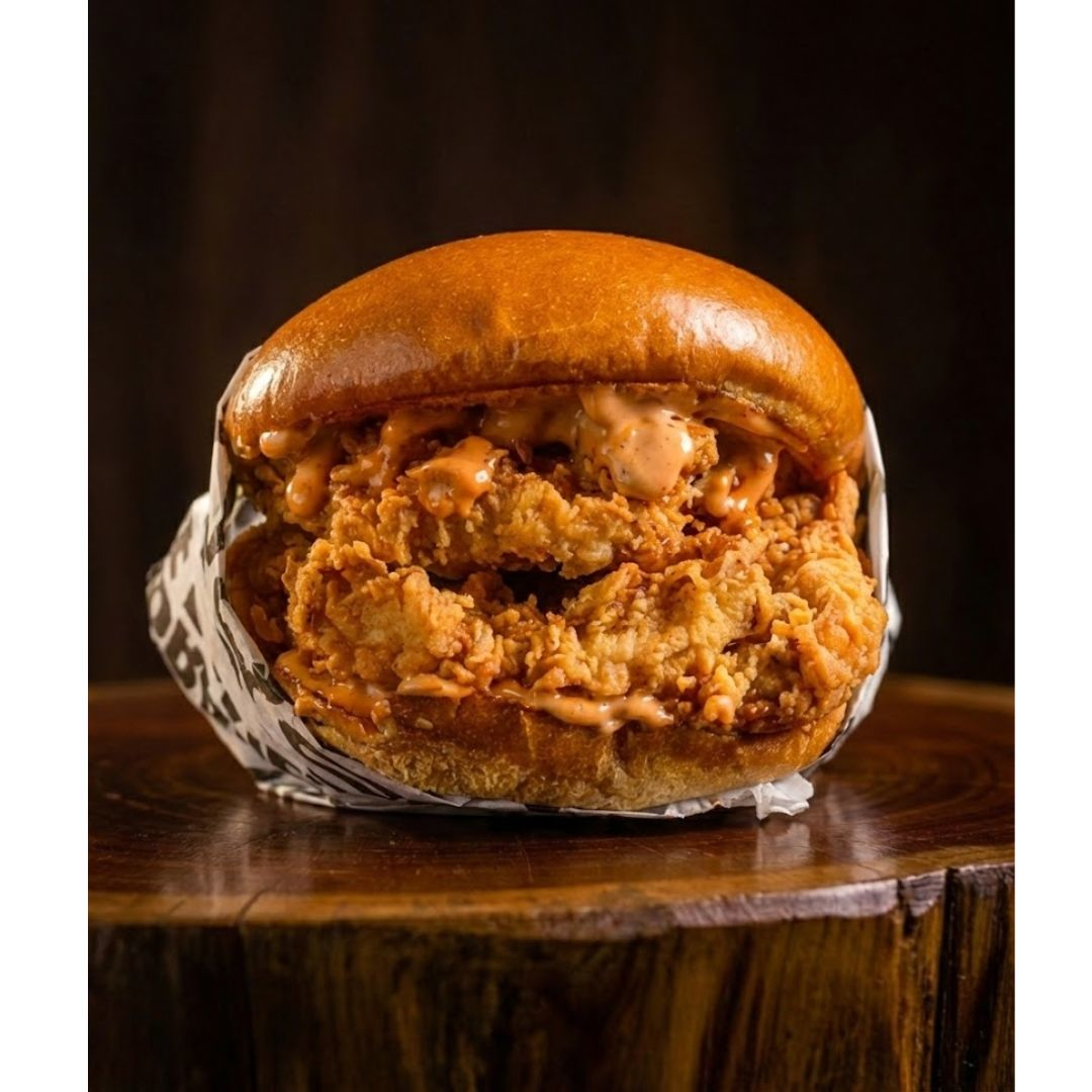 Burger de muuuuito respeito, são 2 suculentos filés de frango empanados e bem crocantes são banhados com o nosso molho rosé especial e ao que nos parece onde este molho toca, deixa tudo perfeito. Ao se unirem ao nosso pão de brioche tostado na manteiga e bem macio torna esse burger IR-RE-SIS-Tí-VEL.
